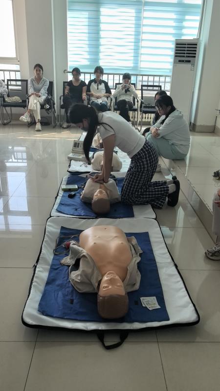 在培训中,实训活动分为理论学习和线下实操两部分。首先实训指导教师对心肺复苏术(CPR)、气道异物梗阻急救、创伤救护等知识进行系统讲解。随后学生分组进行实操训练。教师们严把教学质量关,逐一纠正学生的演练动作,确保学生熟练掌握应急救护技能。