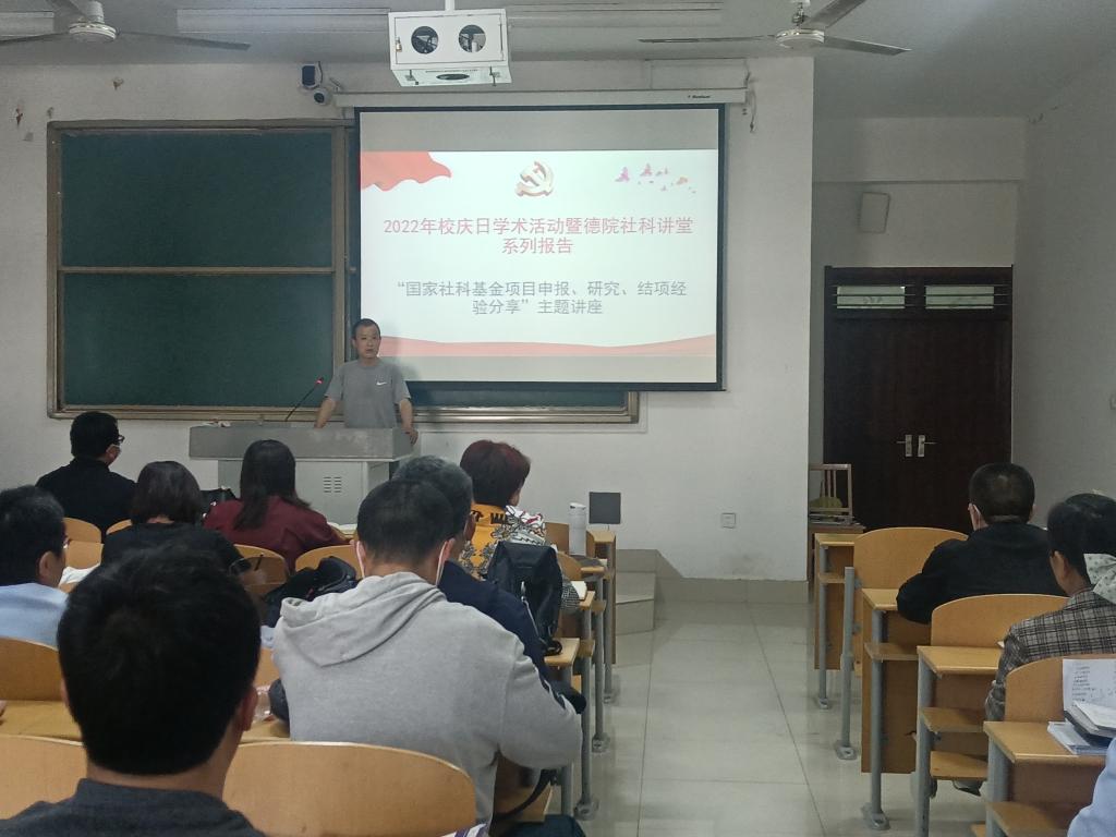 5月17日,法学院陈伟教授在博文楼427作了题为“国家社科基金项目申报、研究、结项经验分享”专题报告会。他简要介绍了学校的科研政策和学院的科研规划,结合自己主持国家社科基金项目的经验,围绕选题、申报书撰写、研究开展、课题结项等主题分享了自己的心得体会。报告重点突出、内容实用,达到了沟通思想、交流经验的预期效果。