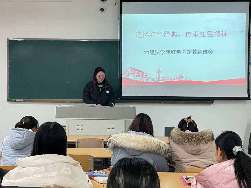 为深入开展党史学习教育,进一步引导广大学生继承和发扬党的优良传统。2021年12月21日,法学院2021级各班于博文楼417教室召开“追寻红色足迹 传承革命精神”主题班会。