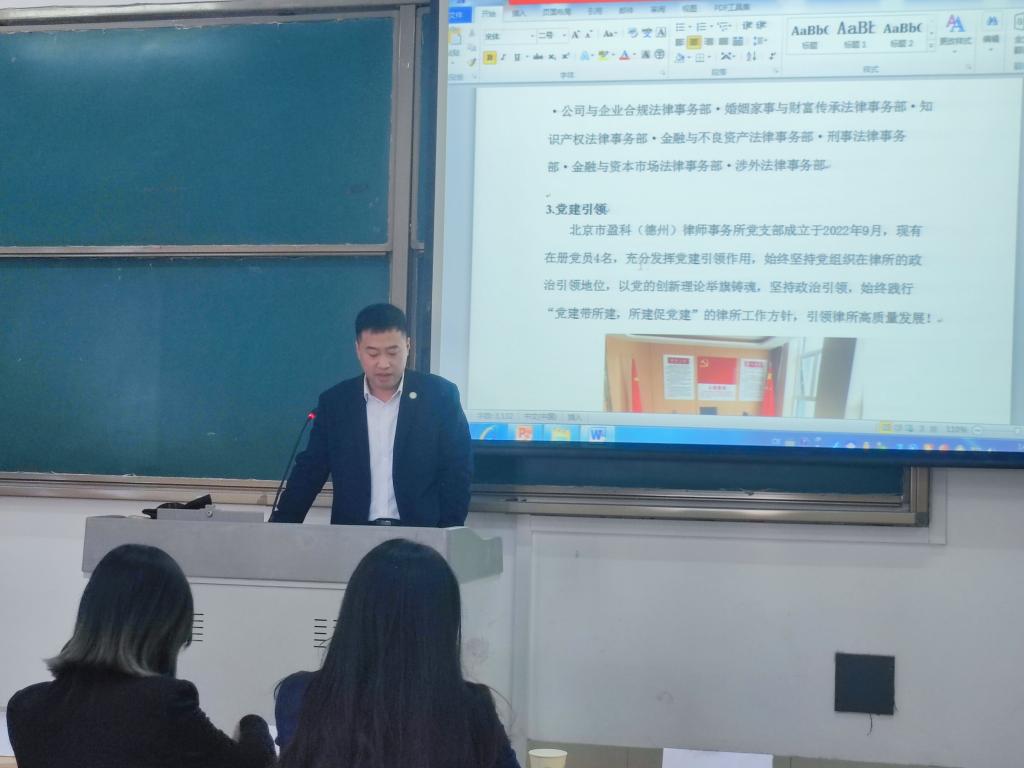 交流会上,盈科律师事务所执行副主任李方超介绍了盈科律师事务所的现状,包括在全球的分布情况和合伙人、律师等资源情况,并播放了盈科律所的宣传片;之后党支部书记付辉向学生们详细的介绍律师这一职业;最后盈科律师事务所一行人对同学们所提出的问题进行解答。通过盈科律所一行人的介绍和回答,同学们对法学这一专业有更全面的了解,对律师这一行业也有了更加深刻的认识。