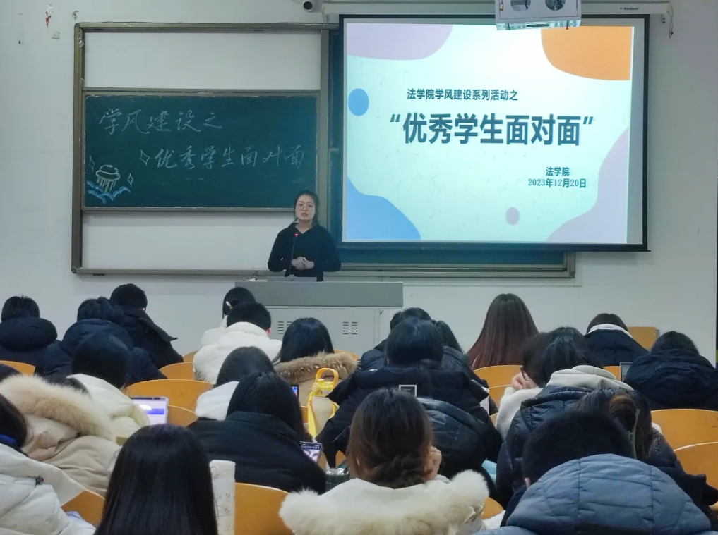为提高学生们学习的积极性和主动性,发挥榜样力量,强化学院学风建设。2023年12月20日,法学院于博文楼427教室组织开展学风建设系列活动之“优秀学生面对面”,法学院优秀学生与2023级本科学生进行面对面交流,分享各自的学习方法和备考经验。