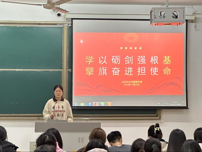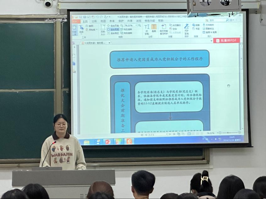 本次培训会议由院学生会分管主席公瑶主持,她从申请入团、入团积极分子的确定、入团积极分子的教育、培养和考察、发展对象的确定、新团员的接受六个部分具体阐述了发展团员工作流程,并结合学院实际,为同学们介绍了《共青团推优入党工作实施方案》,具体介绍了推优入党的范围、条件和比例等。她鼓励学员们作为新时代青年,要努力奋斗,勇于担当时代使命,传承红色精神。