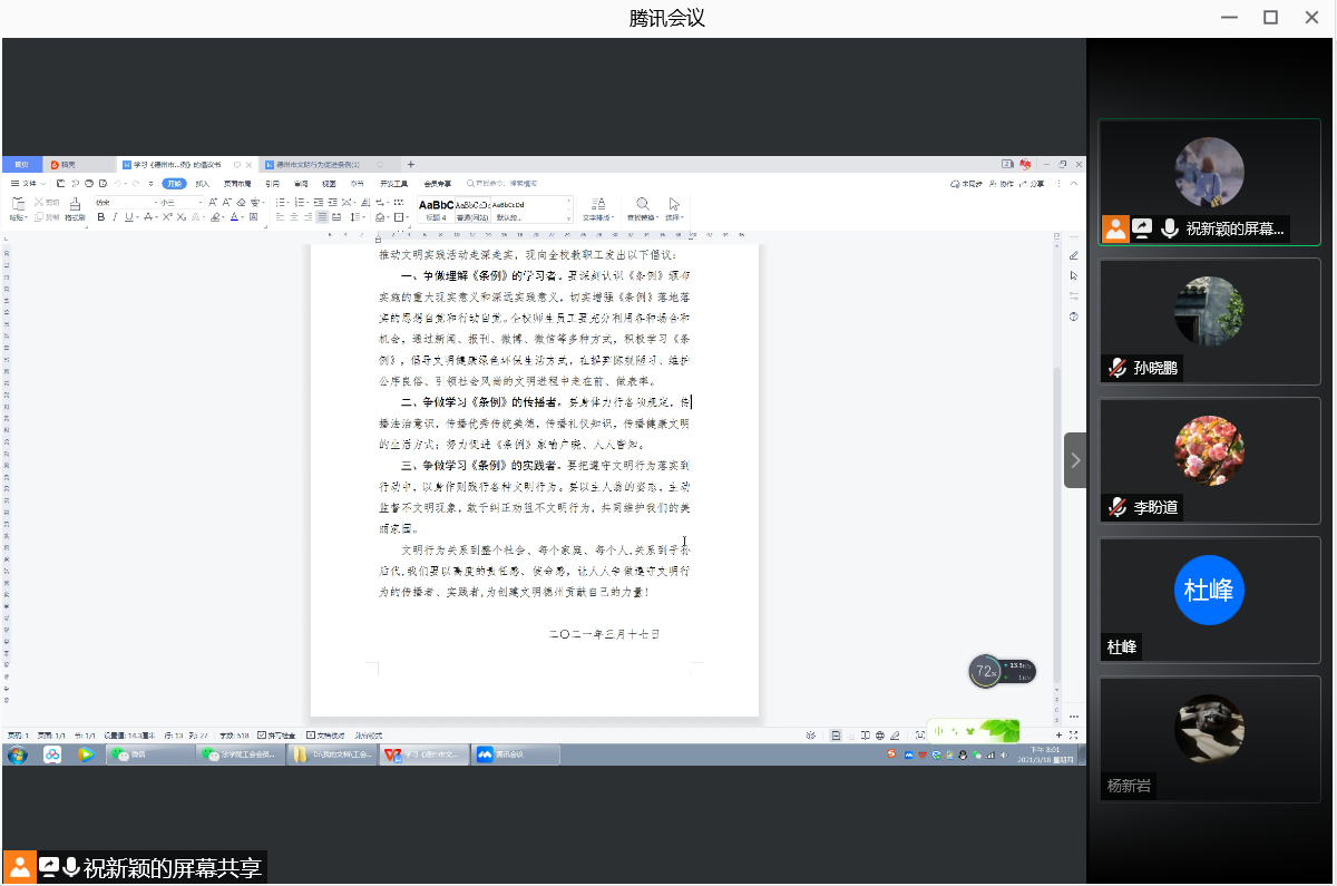 3月18日晚,法学院召开全体教职工视频会议,传达学习德州市创建全国文明城市誓师大会会议精神。