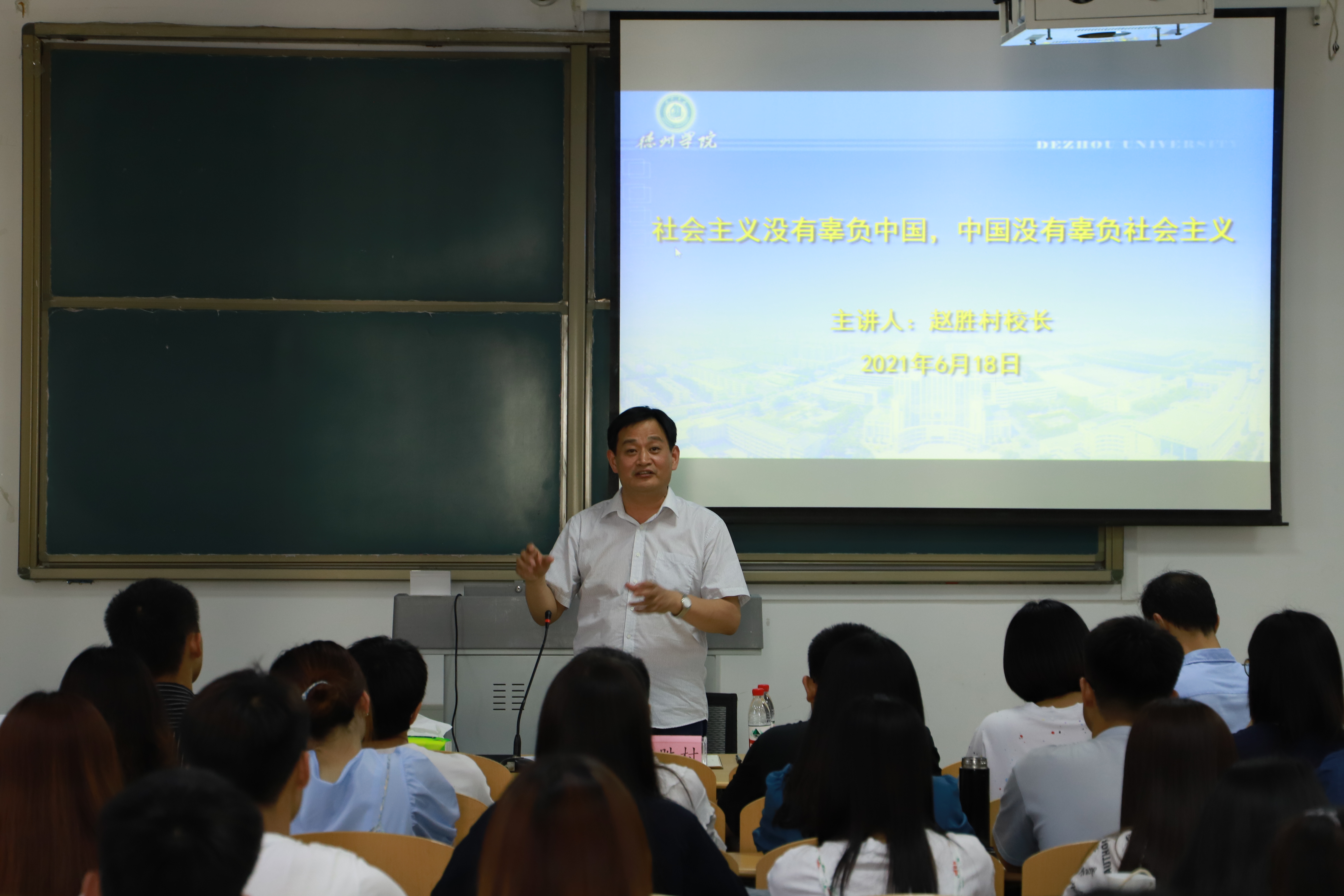 2021年6月18日,赵胜村校长在博文楼427教室为法学院第一学生党支部全体党员、2019级公共事务管理班学生开展了《社会主义没有辜负中国,中国没有辜负社会主义》专题讲座。马克思主义学院李霞教授、法学院班子成员以及师生党员110余人聆听了讲座。