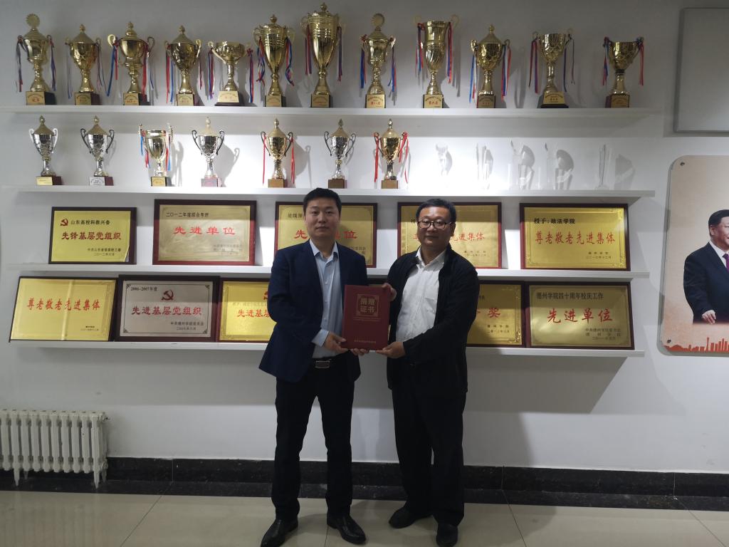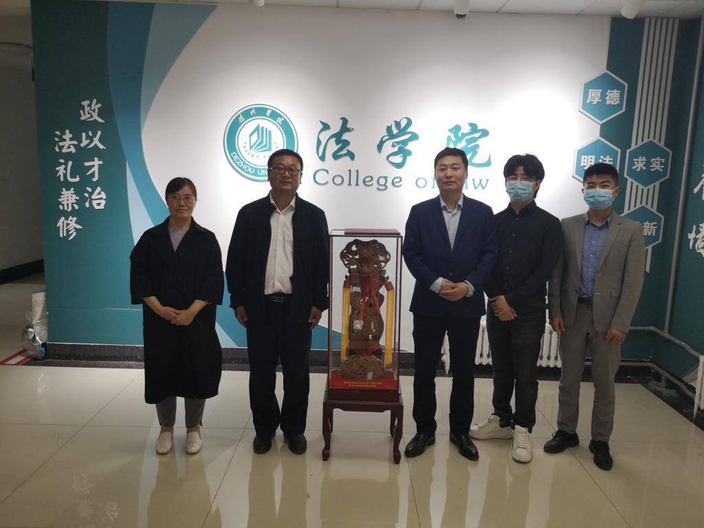 2022年5月11日,德赢ac米兰官方合作建校51周年之际,浙江靖霖(济南)律师事务所副主任朱明志一行2人来访法学院,进行工作交流,并捐赠木如意一件,祝贺德赢ac米兰官方合作51周年华诞,祈愿法学院事业发展如意顺遂。