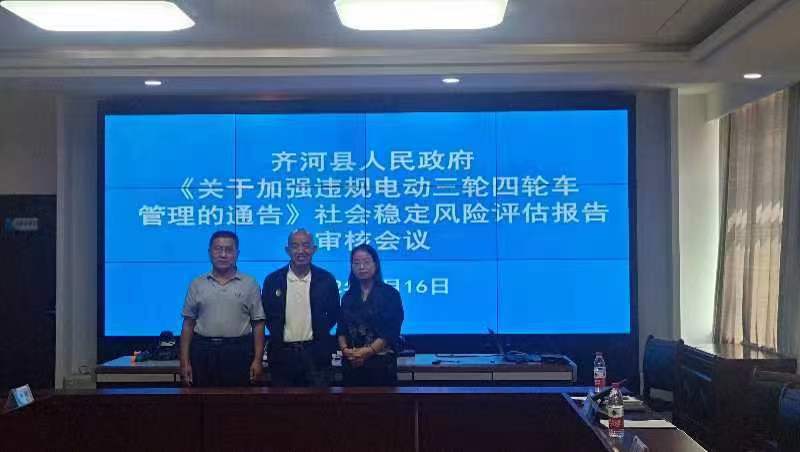 2022年9月16日,法学院徐丽红副教授、秦修业副教授、李安博士参加了齐河县人民政府《关于加强违规电动三轮车管理的通告》的社会风险评估会。三位老师围绕通告的实施,从法规制定、社会管理及风险防范等方面提出了实质性修改建议。
