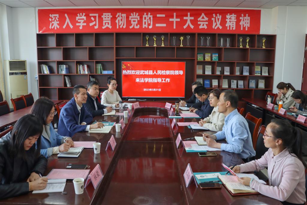 2023年3月31日,武城县人民检察院检察长贾维力一行来法学院交流工作。武城县人民检察院第二检察部主任杜红洲、第一检察部一级检察官王红、办公室副主任王瑞、第一检察部三级检察官助理林荣陪同来访。