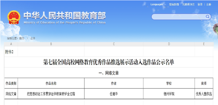 日前,由教育部思想政治工作司、中央网信办网络社会工作局联合举办的第七届“全国高校网络教育优秀作品推选展示活动”遴选结果公示,其中,德赢官网任建华老师网络文章《把思想政治工作贯穿法学教育教学全过程》被评为优秀入围作品。