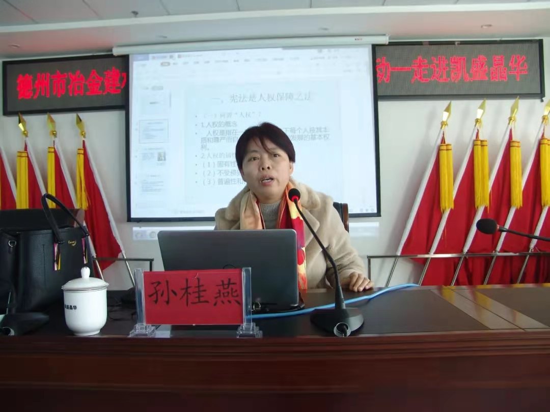 12月4日上午,在第七个国家宪法日到来之际,法学院孙桂燕副教授应邀为凯盛晶华玻璃有限公司做宪法宣传报告。德州市总工会党组成员、副主席孙刚同志,德州市总工会法律部部长英波同志,凯盛晶华玻璃有限公司副总经理、工会主席辛长平同志,凯盛晶华玻璃有限公司干部职工代表共计50余人听取了宪法宣讲报告。