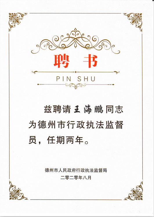 法学院第二教师党支部王海鹏老师被聘为德州市行政执法监督员