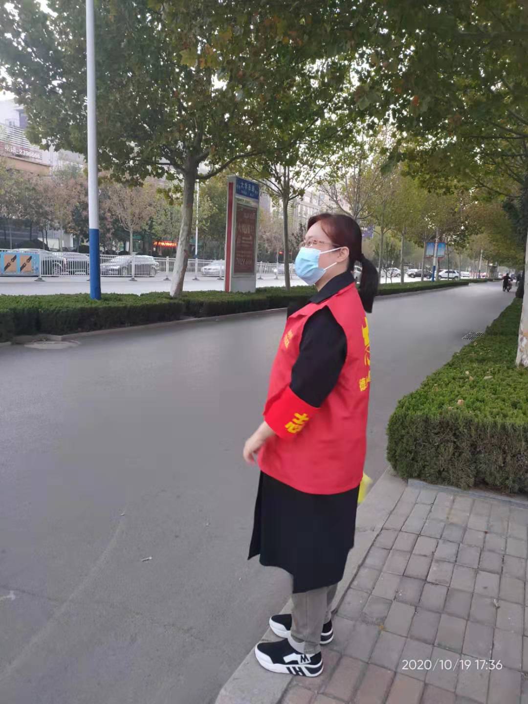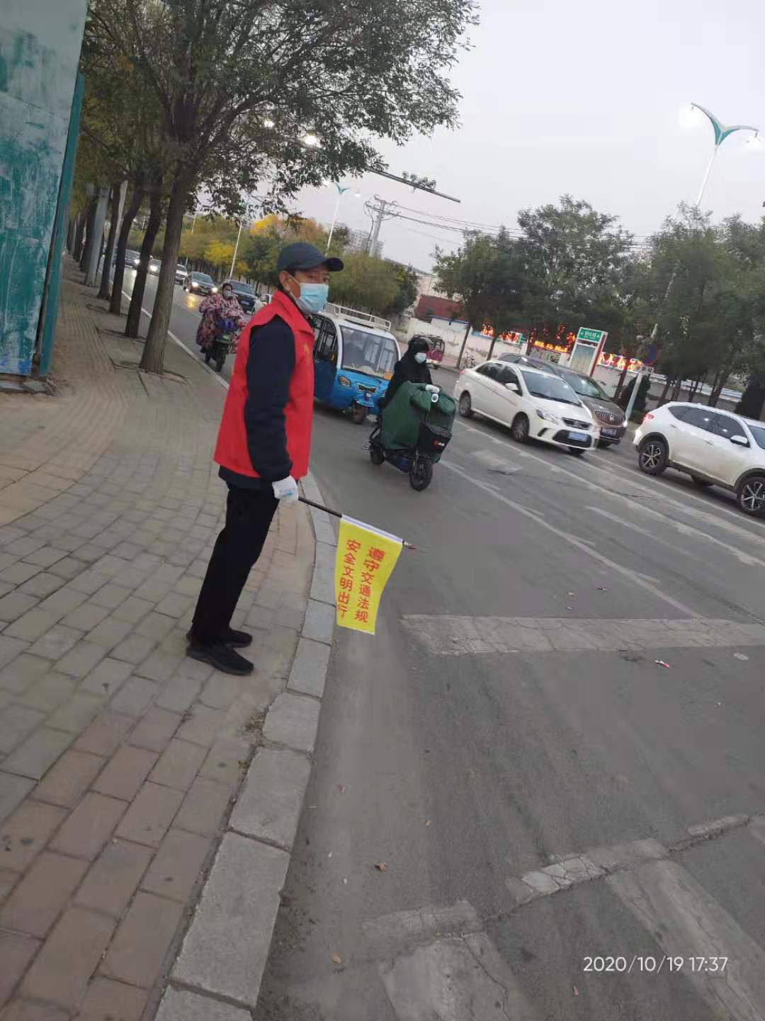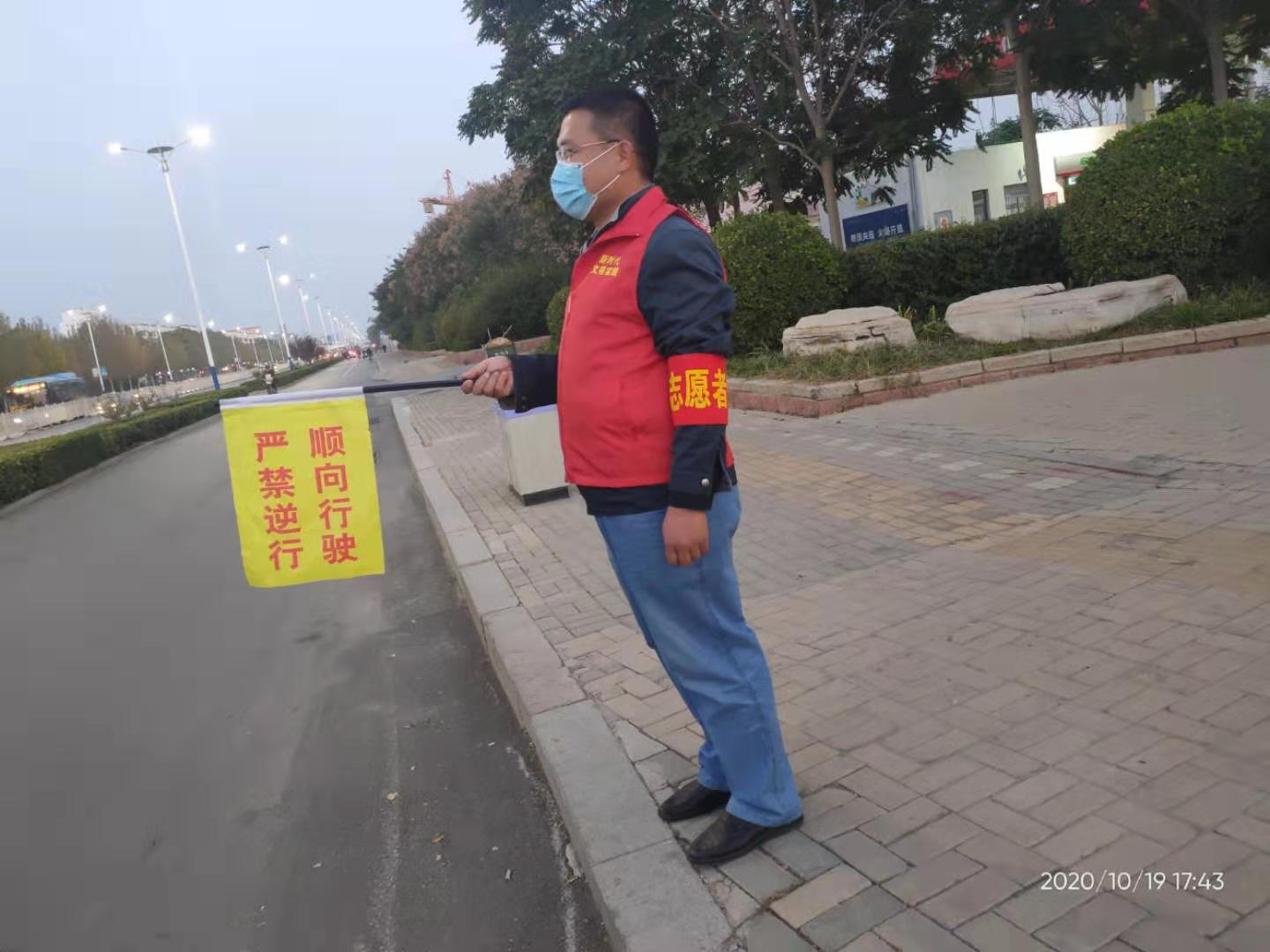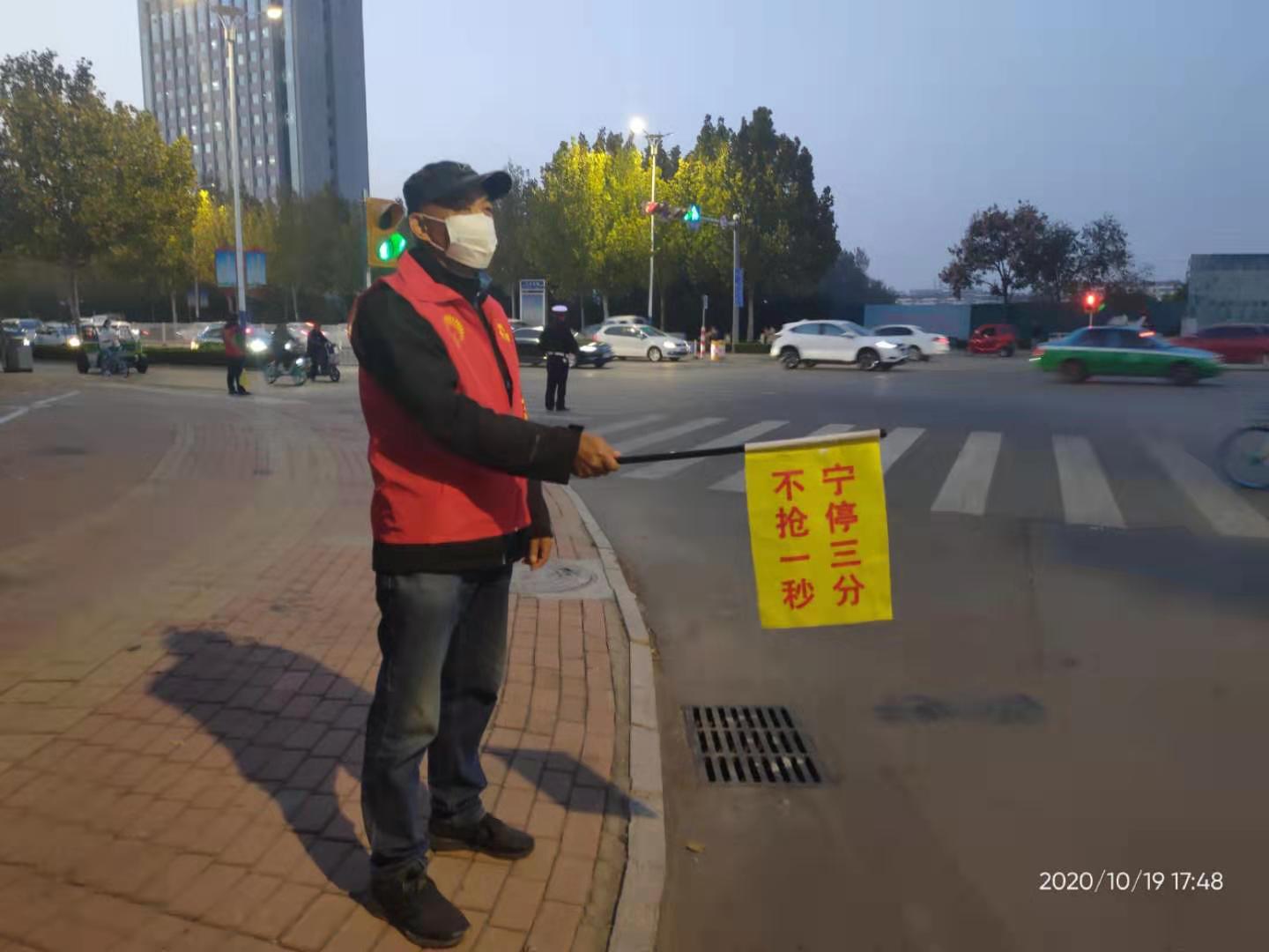 2020年10月19日,法学院第一教师党支部党员教师志愿者在来到德城区德兴路与大学路十字路口协助交警执勤,宣传劝导群众遵守交通规则。